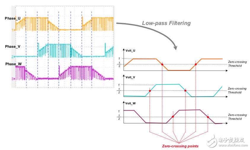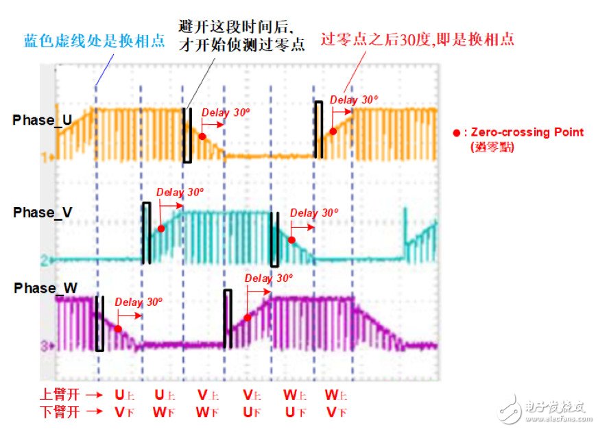 本节要教大家如何利用这段"未被驱动"的惯性转动区的电压变化来取代霍尔组件的功能.请参考下图,首先我们定义"Zero-crossing Point(过零点)",如红点所示."过零点"这个名称的由来是:该点位于某相"未被驱动"期间的正中央,相电流在它之前30度(换相前)与它之后30度(换相后)的流向是相反的。因此,若能侦测到该点的位置,则再延迟30度便是下一个换相点,这样就可以取代了霍尔组件的功能了!