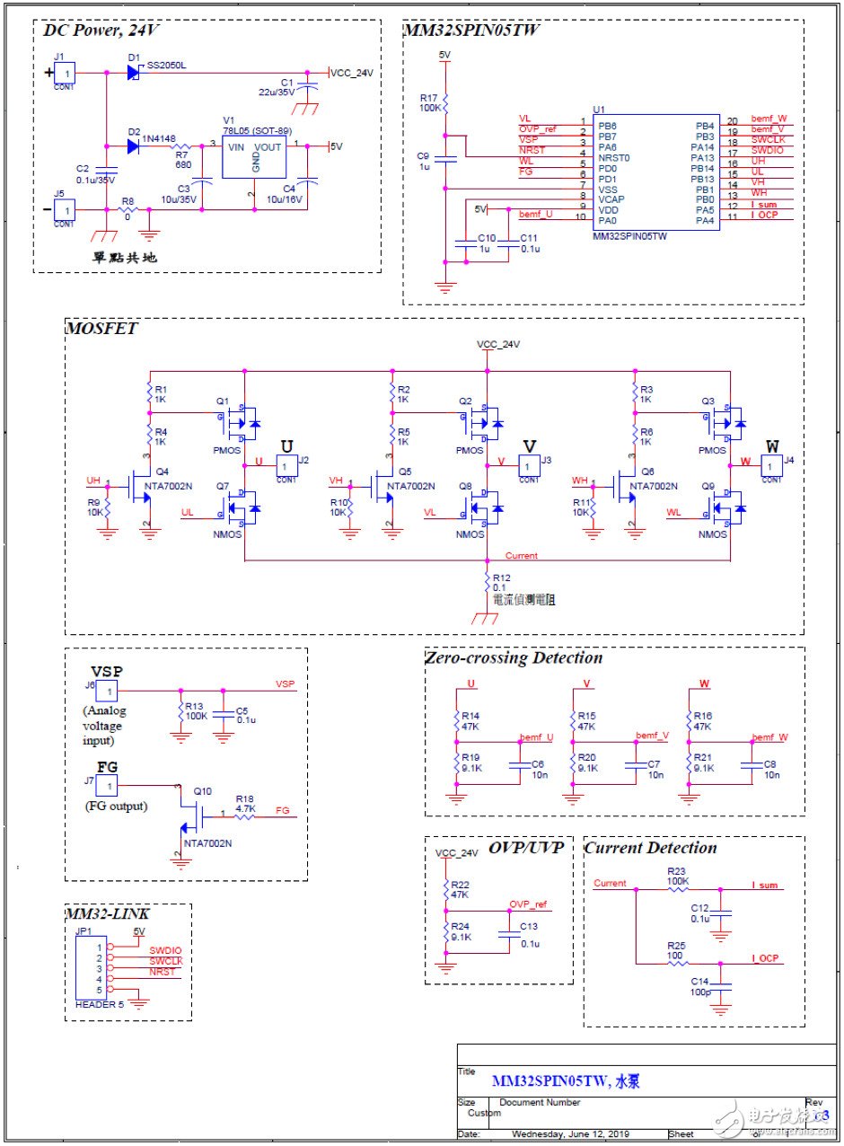 基于MM32SPIN05TW之无传感方波驱动于"小型水泵"的电机驱动板参考原理图如下: