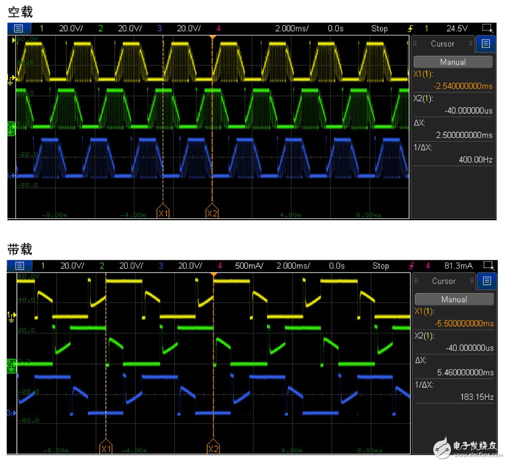 本应用案例采用120度方波驱动,在空载和带载时的相电压波形如下: (转速分别是12000rpm和5500rpm)