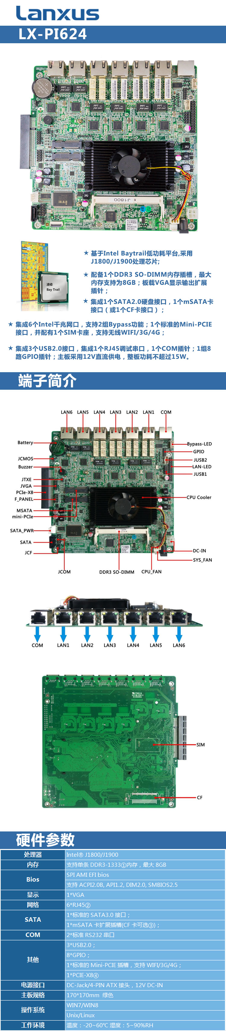 网口:支持6个千兆网卡,2组Bypass 其他:1 ×SATA2.0,1 ×mSATA/CF,3 ×USB2.0,1 ×COM,1 ×8路GPIO 大小:170 × 170mm