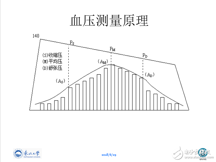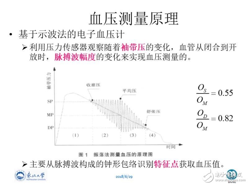 目前大多数电子血压计都是基于振荡法原理,即对动脉施加缓慢变化的压力(此压力称之为静压)在此过程中,提取由于血管搏动而叠加在静压之上的微弱的压力变化信号。一般情况下这个脉动信号的外包络线类似于抛物线形,如图1。