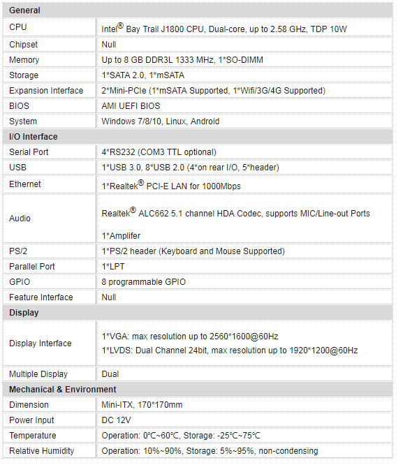 Intel Bay Trail J1800处理器, 4*COM, 1*LAN, 2*Mini-PCIe, DC12V供电
