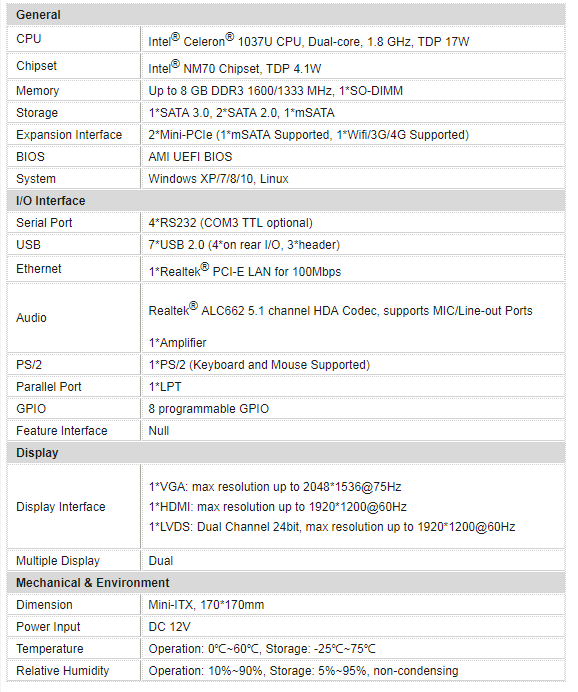 Intel Celeron 1037U处理器, 1*VGA, 1*HDMI, 1*LVDS, 1*LAN, 2*Mini-PCIe, DC 12V供电
