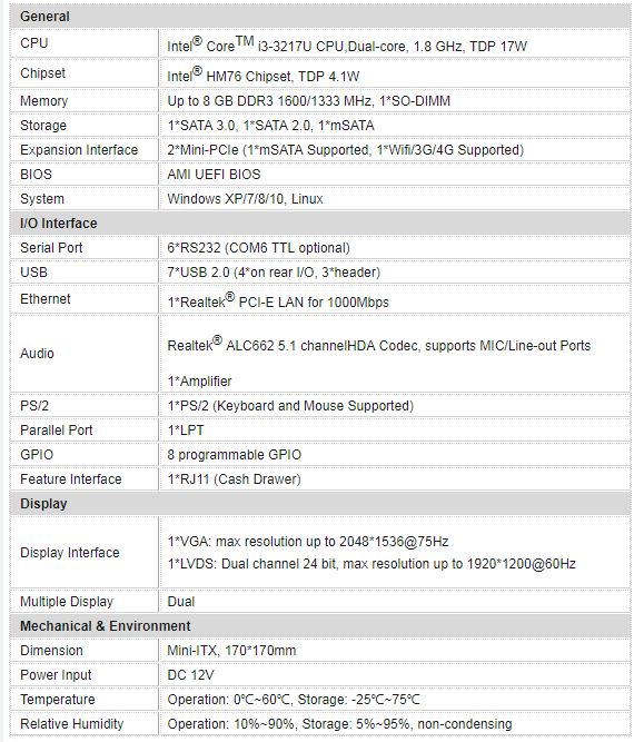 Intel Core i3-3217U处理器, 6*COM, 1*LAN, 2*Mini-PCIe, 1*Cash Drawer, DC 12V供电