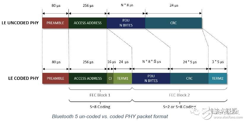 蓝牙5除硬件支持1M,2M PHY,还支持两种编码方式的PHY,这两种编码方式的PHY是基于1M PHY的基础,使用1M PHY的物理通道。新的编码分为两种,一种编码PHY为500kbps(S=2),另外一种编码PHY是125kbps(S=8)。