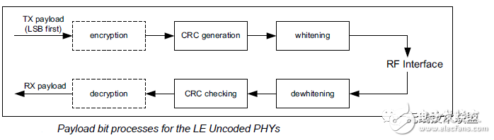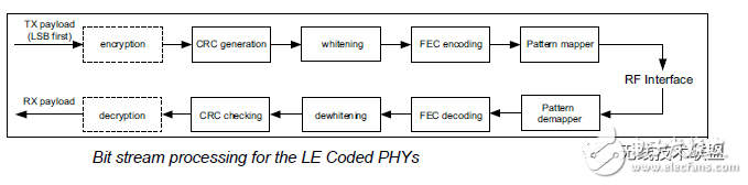 在没有编码方式下,TX数据包数据bit流通过加密(可选项),CRC效验,白化之后发送出去;RX端接收到数据流解调后校验CRC,解密,得到原始数据包数据。