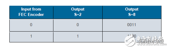 模式映射的目的是整理输出前向错误编码数据,输出的方式分为两种模式(P symbols),一种P=1(S=2),一种P=4(S=8),两种模式下把前向错误编码数据进行加工,然后输出。由下面的表格所示,当P=1时,输出的data和输入保持不变,1位输入,1为输出;当P=4时,编码为4位再输出,所以可以看到P=4(S=8)时,输出的data数据量会更多,更进一部压缩实际可以传输的有效payload数据。