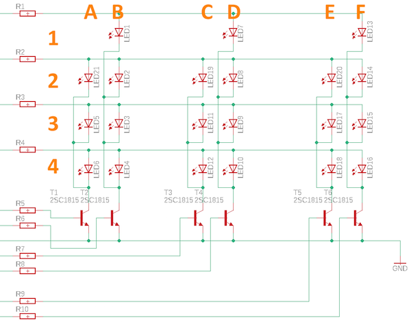 As你可以看到,我们正在为这个项目建立一个共同的阴极矩阵。因此,LED的阴极连接在一起,然后通过NPN晶体管连接到GND。电阻R1至R4是LED的限流电阻,R5至R10是晶体管。