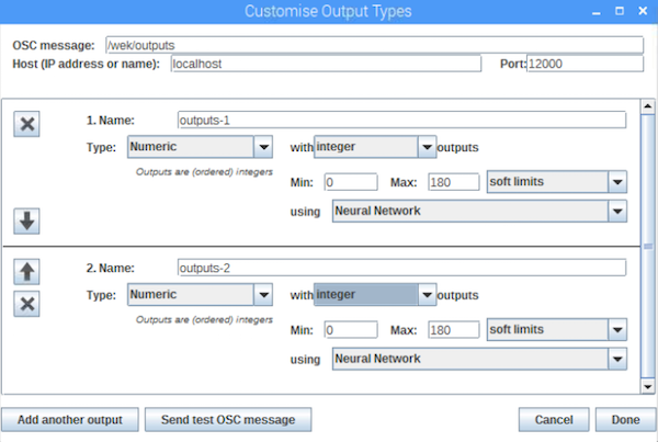 现在打开Wekinator并进行如下图所示的设置。将输入和输出设置为2,然后将类型设置为“自定义”,然后单击“配置”。