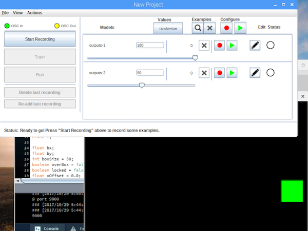 现在将处理窗口中的绿框拖到左侧中央并设置设置在Wekinator窗口中,如下所示。之后,开始录制半秒。