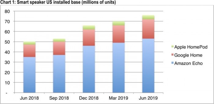 智能音箱的安装数量预计为7600万台,而苹果的HomePod仅占了其中的5%。