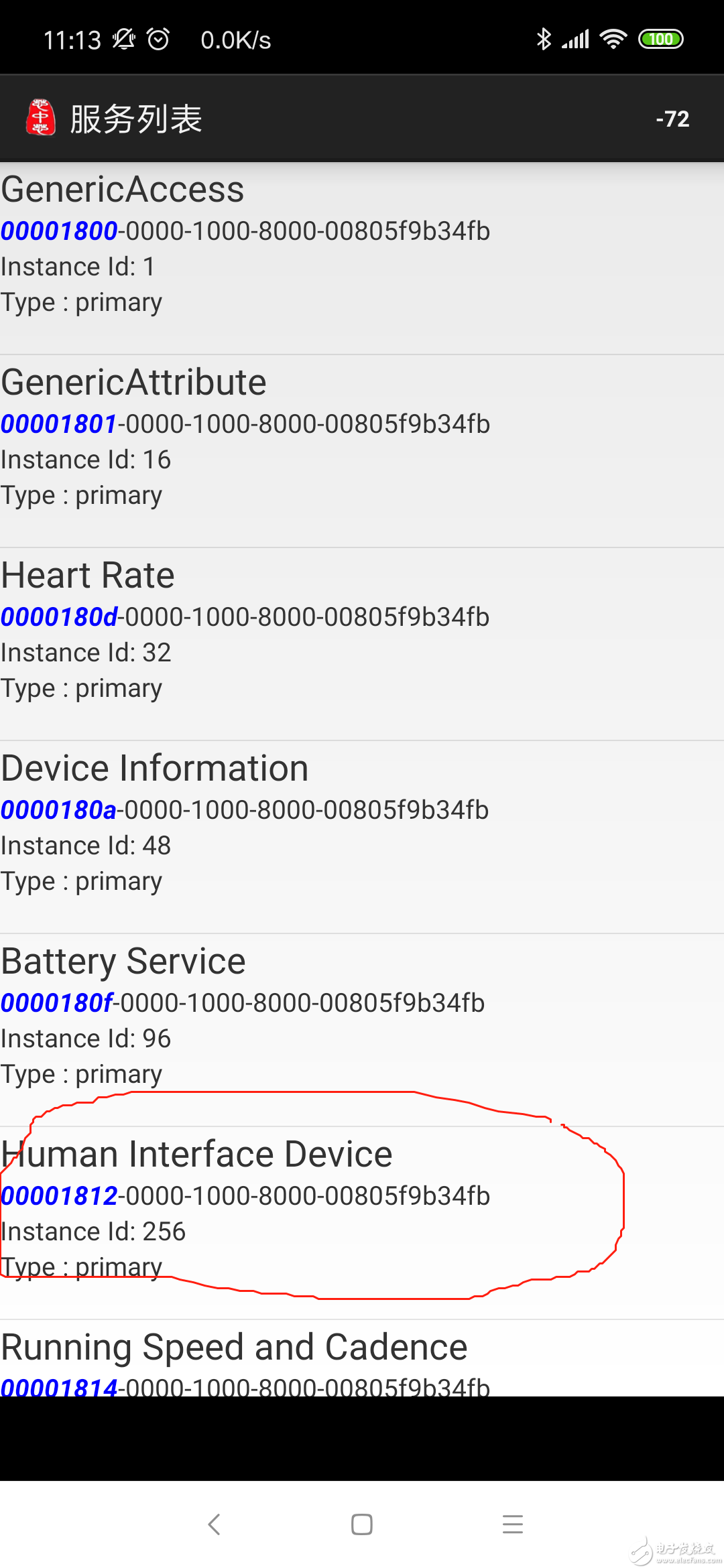下图10是未添加HID service时打开调试工具看到的服务列表,可以看见本来除了GAP(generic access profile)和GATT(generic attribute profile)外,有4个services,与我们在图5代码中所见一致,图11是我们添加代码后再打开测试工具看到的服务列表,可以看见HID service已经添加进去了。