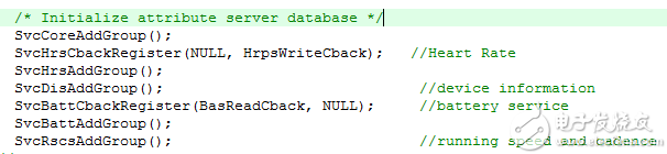 由图5可知,该profile已经添加了4个services。(注意,4个中不包括GAP和GATT,这两个services是每个GATT-Based Profile都必须添加的,代码中由函数SvcCoreAddGroup进行添加)分别是,测心率的(Heart Rate),读取设备信息的(device information),测电量的(battery service)和测速率的(running speed and cadence)。