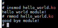 将hello_world.ko发送到板子上,然后在板子上运行insmod hello_world.ko, 会调用hello_init()函数运行rmmod hello_world.ko,会调用hello_exit()函数