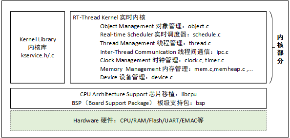 内核是操作系统最基础也是最重要的部分。下图为 RT-Thread 内核架构图,内核处于硬件层之上,内核部分包括内核库、实时内核实现。