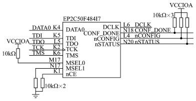 图1是FPGA的配置电路。CY7C68013A可以通过PS模式来配置FPGA,而不需要其他的下载器。系统选择的FPGA型号是EP2C50F484,为了使用PS模式下载,需要分别设置MSEL0=1,MSEL1=0,MSEL2=0。注意配置端口需要增加上拉电阻来保证其正常工作。