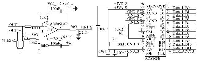 对于ADS803E的输入信号首先要经过一级运放跟随,目的是为了将输入信号控制在其测量范围之内。ADS803E的测量范围可以通过改变图中电阻R1与R2的值来实现,其量程范围为0~2×R1+R2R1。ADS803E的输出要在6个时钟之后才会有效,也就是说其数字输出对于模拟输入存在6个时钟的延时。同时,为了减小系统的功耗,在不需要进行ADC转换的时候,可以通过FPGA将ADS803E的时钟停止。