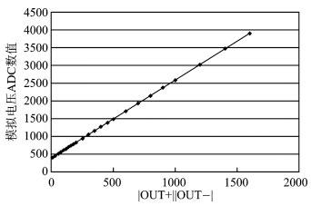 测试结果如图5所示,利用直流电源作为测试源对数据采集系统进行性能测试。分别测试OUT+和OUT-为0~1.2 V和-1.2~0 V的变化,然后从PC端得到ADC的转换结果。图中横坐标是|OUT+|与|OUT-|的和,纵坐标是与模拟电压相对应的ADC数值。通过对图中数据的拟合,得到模拟信号和数字信号的线性关系y=357.144+2.223x。这就意味着每m V电压对应2.2的数字输出,也可以表示为每1个数字值对应0.45 mV的模拟电压。直线在Y轴上的截距被称为基值,一般为300~400个ADC计数。