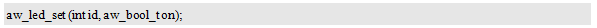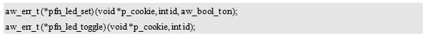 对于aw_led_on、aw_led_off和aw_led_toggle接口来说,它们的职责单一,仅仅需要指定控制的LED,即可完成点亮、熄灭或翻转操作,无需其它额外的参数。对于这类接口,参数仅仅需要id,这些接口的原型可以定义如下(还未定义返回值):