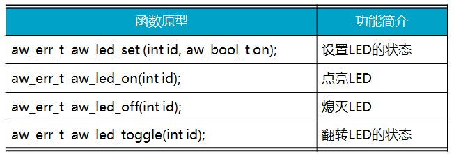 表13.1 LED通用接口(aw_led.h)