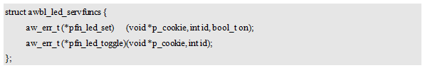 在一些特殊的应用场合中,比如,LED闪烁,用户可能并不关心具体的操作是开灯还是关灯,它仅仅需要LED的状态发生翻转。此时,可以定义一个用于翻转(toggle)LED状态的专用接口,比如:“aw_led_toggle”
