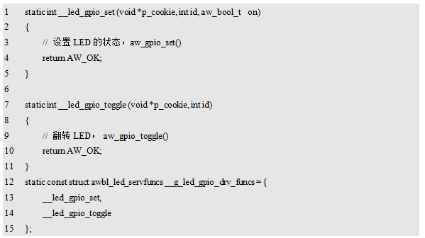 实现接口的核心是实现aw_led_set()和aw_led_toggle()这两个接口。对于不同的底层硬件设备,LED实际控制方式是不同的,比如,最常见的,通过GPIO直接控制一个LED,简单范例详见程序清单13.2。