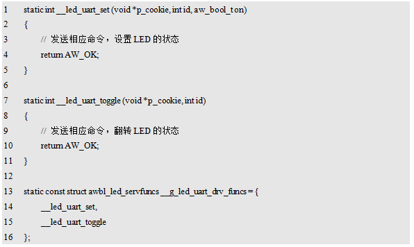 由于LED的实现属于AWBus-lite的一部分,因此,命名使用"awbl_"作为前缀。这里定义了一个虚函数表,包含了两个方法,分别用于设置LED的状态和翻转LED。针对不同的硬件设备,都可以根据自身特性实现这两个方法。GPIO控制LED的伪代码详见程序清单13.4,UART控制LED的伪代码详见程序清单13.5。