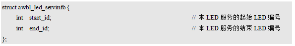 在一个LED硬件设备中,可能包含多个LED,例如,MiniPort-LED扩展板,包含了8个LED,但一般来讲,一个LED硬件设备中所有LED的编号是连续分配的,基于此,仅需知道一个硬件设备中LED的起始编号和结束编号,就可以获得该硬件设备中所有LED对应的编号,例如,一个硬件设备中LED的起始编号为2、结束编号为9,则表示在该硬件设备中,各个LED的编号分别为:2、3、4、5、6、7、8、9,共计8个LED。为此,可以定义一个LED服务信息结构体类型,专门用于提供LED服务相关的信息,例如:
