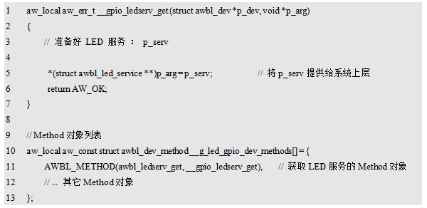 如此一来,即定义了一个名为awbl_ledserv_get的Method类型,该Method类型即表示了一类操作:获取LED服务。后续在底层设备驱动的实现中,只要一个设备能够提供LED服务,则表示系统可以从中获取到一个LED服务,此时,该驱动就可以提供一个入口函数,用于获取LED服务,并使用该Method类型对入口函数进行标记。这样,在系统启动时,就可以通过查找系统中所有被该Method类型标记的入口函数,然后一一调用它们,以此获得所有设备提供的LED服务。