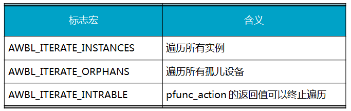 其中,AWBL_ITERATE_INSTANCES和AWBL_ITERATE_ORPHANS标志用于指定需要遍历的设备,即在哪些设备上执行pfunc_action函数。在硬件设备列表中,定义了当前系统中所有的硬件设备,当设备具有与之匹配的驱动时,才能够变成一个实例,被系统正常使用,而如果一个设备没有与之匹配的驱动,该设备将变成一个孤儿设备,由于没有与之匹配的驱动,因此系统暂时无法使用孤儿设备。AWBL_ITERATE_INSTANCES表示表示需要遍历所有实例,即具有相应驱动的设备。AWBL_ITERATE_ORPHANS表示需要遍历所有的孤儿设备。若要遍历所有的实例和孤儿设备,可以使用或运算同时设定这两个标志。