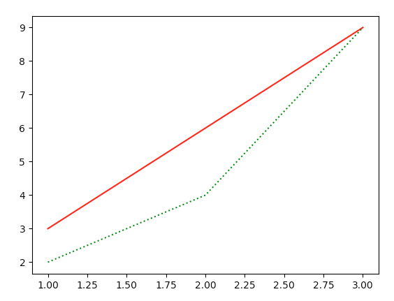 最后一个参数是由两个字符构成的,分别是线条的样式和颜色。前者是红色的直线,后者是绿色的点线。关于样式和颜色的说明请参见plot函数的API Doc:matplotlib.pyplot.plot