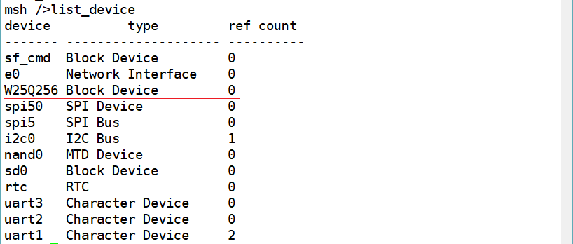 在 stm32f429-apollo 开发板上SPI Flash挂在了 SPI5 总线上,对应的SPI Device的设备名为spi50。在终端输入list_device命令可以看到名为spi50的设备类型为SPI Device,就说明 SPI 设备添加成功。如果没有出现相应的设备,则需要检查驱动程序,查找错误。
