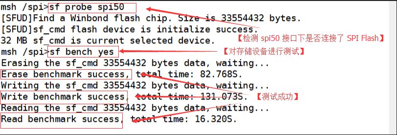 为了确保该驱动工作正常,可以使用sf命令对该设备做benchmark测试。该功能由sfud组件提供,可以通过检查存储设备的读、写和擦除功能来判断存储设备的驱动程序是否正常。 如果像下图一样提示成功,所示则认为该驱动工作正常。如果无法通过测试,则需要检查驱动程序,使用逻辑分析仪对存储设备的接口波形进行分析。测试过程如下图: