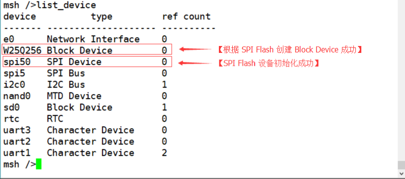 在终端输入list_device命令如果看到名为W25Q256的设备类型为Block Device,这说明块设备已经创建成功,如果失败则需要对spi50设备进行检查。