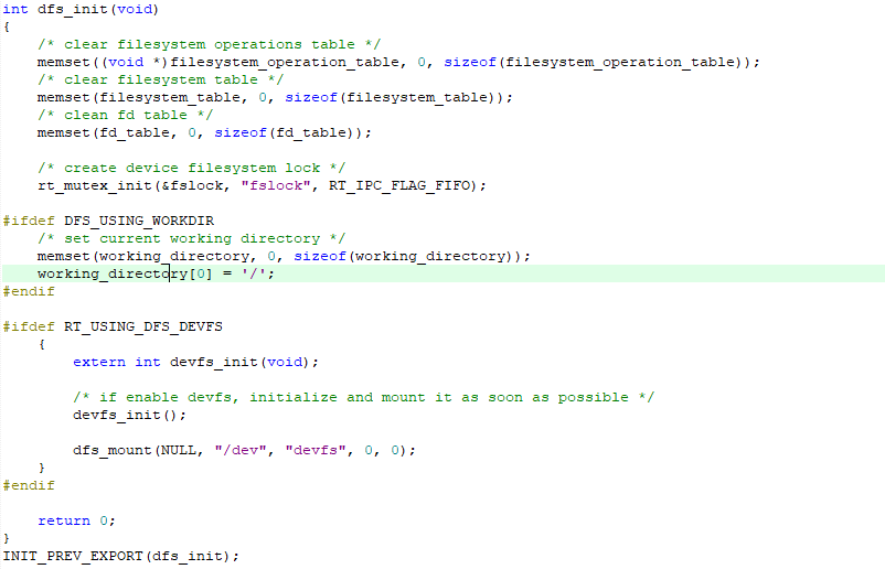 DFS 框架的初始化主要是对内部数据结构以及资源的初始化。这一过程包括初始化文件系统必须的数据表,以及互斥锁。该功能由如下函数完成。如果开启了组件自动初始化功能,该函数会被自动执行,否则需要手动调用运行。
