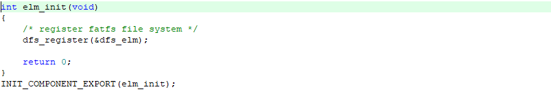 这一步的初始化主要是将elm FatFS的操作函数注册到 DFS 框架中。该功能由如下函数完成。如果开启了组件自动初始化功能,该函数会被自动执行,否则需要手动调用运行。