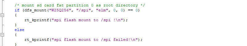 文件系统的挂载指的是将文件系统和具体的存储设备关联起来,并挂载到某个挂载点,这个挂载点即为这个文件系统的根目录。在下面的示例中,我们将elm FatFS文件系统和名为W25Q256的存储设备关联起来,并且挂载到/spi文件夹中。(这里可以挂载到/spi文件夹的原因是stm32f429-apollo BSP的文件系统根目录已经挂载了RomFS,并且已经创建了/spi文件夹。如果没有特殊情况,文件系统可以直接挂载到根目录/上。)