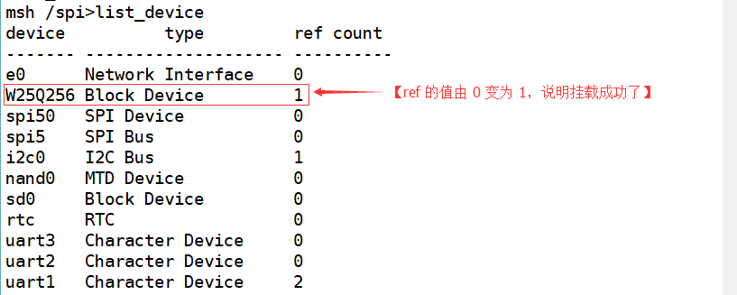 经过了上面的创建文件系统操作,我们重启开发板(会自动重新执行挂载函数),就可以成功地挂载文件系统了。可以看到提示spi flash mount to /spi !。这时再次使用list_device命令可以看到W25Q256设备已经被挂载成功。如下图所示: