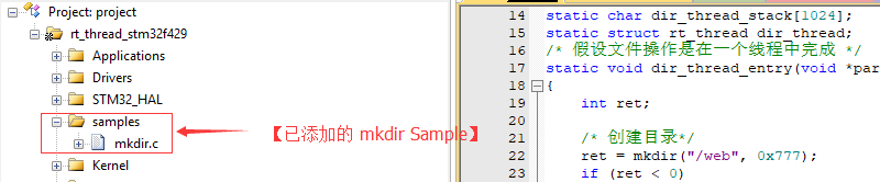 本节以创建文件夹操作为例,介绍如何使用 RT-Thread 文件系统 Sample 来对文件系统进行操作。