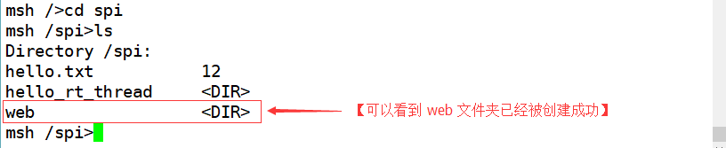 重新编译后下载运行,在 msh 中可以使用mkdir_sample_init命令来创建 web 文件夹,效果如下图所示: