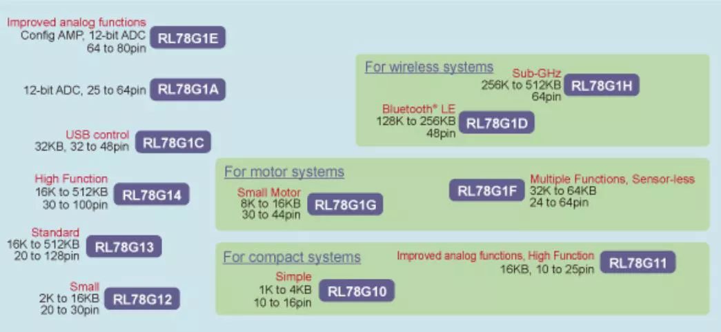 RL78/G1系列微控制器是基于瑞萨RL78 CPU内核为核心构建而成,该产品具有真正的低功耗特性和安全功能,除了常用的功能外设的系列之外,还添加了低功耗无线Sub-GHz的RL78/G1H和低功耗蓝牙RL78/G1D产品,以及用于无传感器无刷直流电机控制的RL78/G1F微控制器。下面将对这些产品系列的特性分别进行阐述。