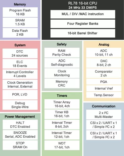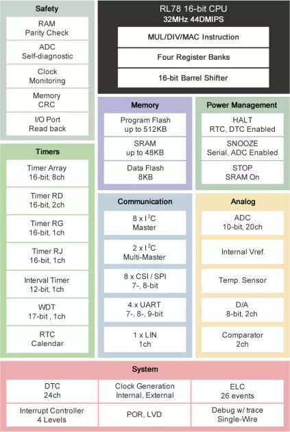 RL78 / G14微控制器系列是业界最低的消耗电流(CPU:66μA/ MHz,待机(STOP):240 nA)和44 DMIPS(32 MHz)的高计算性能的平衡产品。其内置的多功能定时器,支持使用三相互补PWM输出的三相电机控制。它们具有片上振荡器、数据闪存、A / D和D / A转换器、比较器等等。内置安全功能(检测硬件非法操作)支持家用电器安全标准(IEC / UL 60730)。凭借广泛的30~100引脚阵容和高达512 KB的片上闪存,这些微控制器可用于多种应用,如电机控制、消费类和工业设备。下面是微控制器的功能框图。