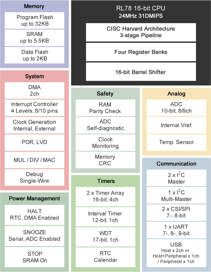 RL78 / G1C微控制器系列除了两个全速USB 2.0主机通道外,还具有兼容电池充电规范BC 1.2,用于快速电池充电。这些微控制器适用于通过USB连接的办公设备,如打印机、鼠标和键盘,以及医疗设备的USB充电器、手机电池等。下面是微控制器的功能框图。