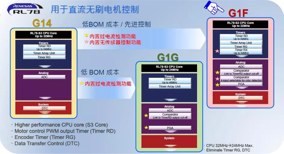 瑞萨电子推出的RL78/G1系列是RL78产品家族中的通用型微控制器,该系列增强了外围设备的功能,新增无线和蓝牙外设,并具有真正的低功耗特性。RL78/G1F内置了无传感器BLDC电机控制单元,进一步简化了BLDC电机控制,为注重能效的家用电器和电动工具应用提供高速和高精度的电机控制。这些微控制器能够满足很多复杂和特殊应用需求。