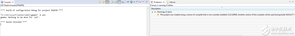 出现该警告的原因是PGA970Reference Firmware是基于CCS6.0 ti-cgt-arm_5.2.6编译器进行开发。CCS7.0默认编译器为16.9.0.LTS版本。根据[4]中说明,在大多数情况下,新版本的编译器应该对老版本编译器向下兼容。同时,CCS7.0在PGA970工程项目编译完成之后,并无错误提示。在编译器端,无重要问题出现。