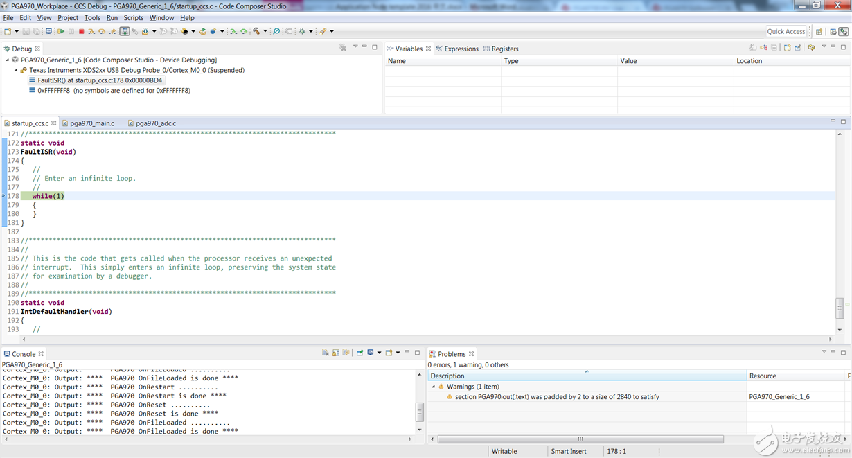 在使用CCS7.0和XDS200对PGA970进行调试与仿真时,需要参考[1]中步骤进行编译器配置。由于CCS7.0默认编译器版本与PGA970固件开发时使用的编译器版本不同,编译过程中出现警告,该警告并不会对编译结果产生直接影响,从而容易会被忽视,导致PGA970固件程序会反复进入FaultISR()中断,固件开发无法顺利进行。本篇Blog旨在展示该问题现象,帮助开发者顺利进行PGA970的固件开发。