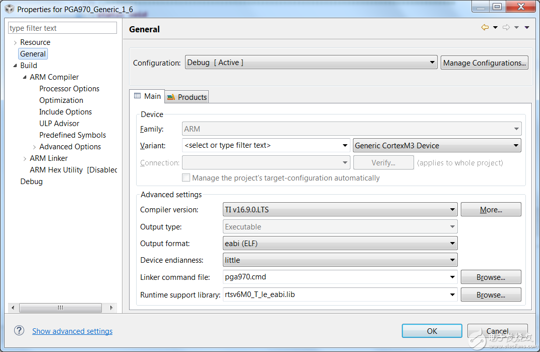 此时在Project:PGA970Reference Firmware -> Properties -> General 目录下,Compiler version为TI v16.9.0.LTS,如Figure 3所示。
