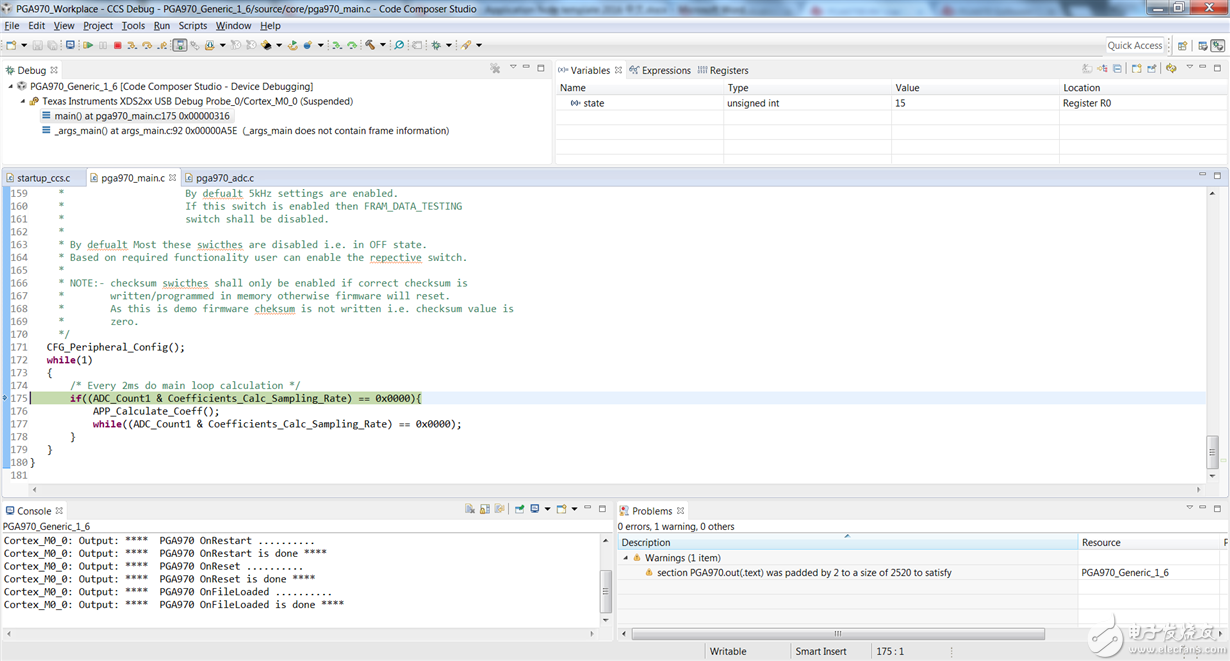 完成编译器修改后, 先CleanPGA970Reference Firmware,再重新编译。编译完成后,Figure 1中的Warning消失。之后,进行Debug仿真,如Figure 5所示,Firmware成功进入main.c下的配置函数CFG_Peripheral_Config()与参数计算函数APP_Calculate_Coeff()。