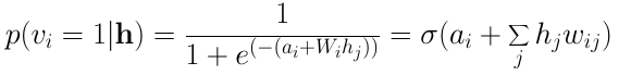 RBM中的每个神经元只可能是二元状态0或1中的一种。我们最关心的因子是隐藏层或输入层地神经元位于状态1(激活)的概率。给定一个输入向量v,单个隐藏神经元j激活的概率为: