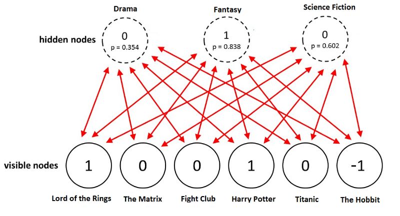 让我们看一个例子。一个用户喜欢《指环王》和《哈利波特》,但不喜欢《黑客帝国》、《搏击俱乐部》、《泰坦尼克》。用户还没有看过《霍比特人》,所以相应的评分为-1. 给定这些输入,玻尔兹曼机可能识别出三个对应电影类型的隐藏因子戏剧、奇幻、科幻。